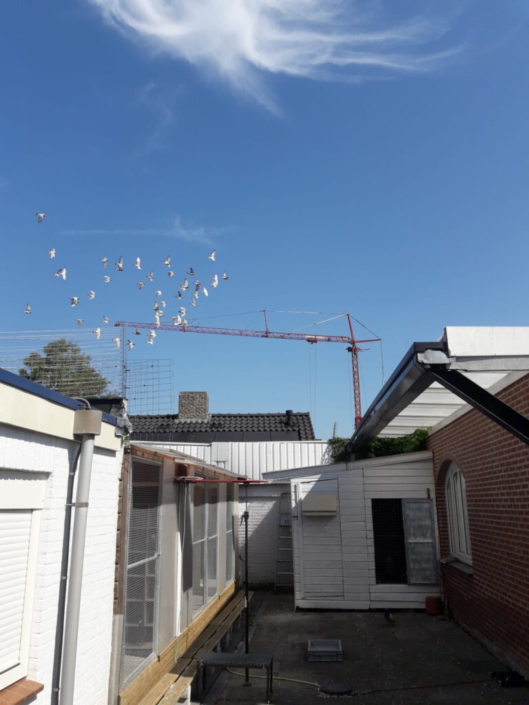 Onze vroege jongen (47 + 1 jaarling) op de vrijdagmorgen in de mandjes gezet na het schoonmaken van de hokken. Ik heb ze vlot 1 voor 1 losgelaten in Hengevelde. (10 kilometer) Ongeveer elke 30 seconden 1 duif. Bij thuiskomst 1 duif in het hok (de jaarling) en er zat een koppel op het dak van het huis. Daar zie ik ze liever niet zitten maar ze voelen zich daar op het moment veiliger dan op het dak van ons zwembad. Wellicht heeft het te maken met de geweldige grote bouwkranen die vlak bij ons achter het huis staan waar een stuk of 26 nieuwe woningen gebouwd worden. De jongen op het dak binnengeroepen en de klok gaf aan 30 stuks en nog 6 op het dak van het huis die bleven zitten. Daarna vielen er vlot 5 duiven bij, afijn om 12 uur was alles weer thuis. De volgende africhting zal weer een stuk verder zijn in afstand.