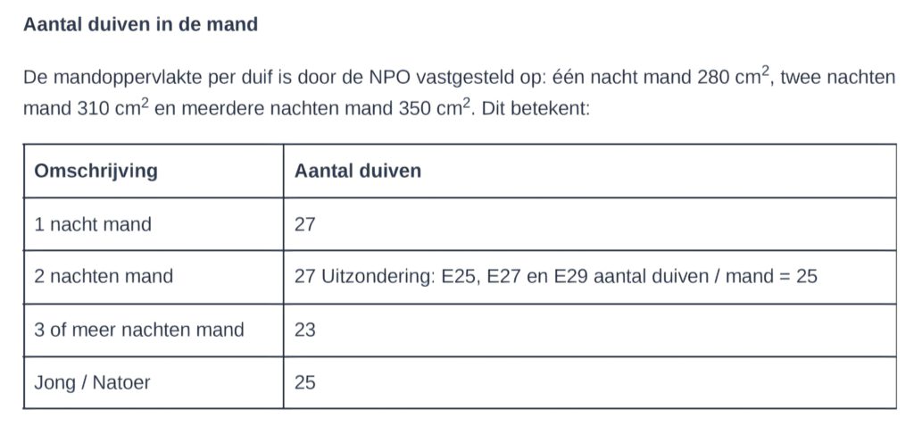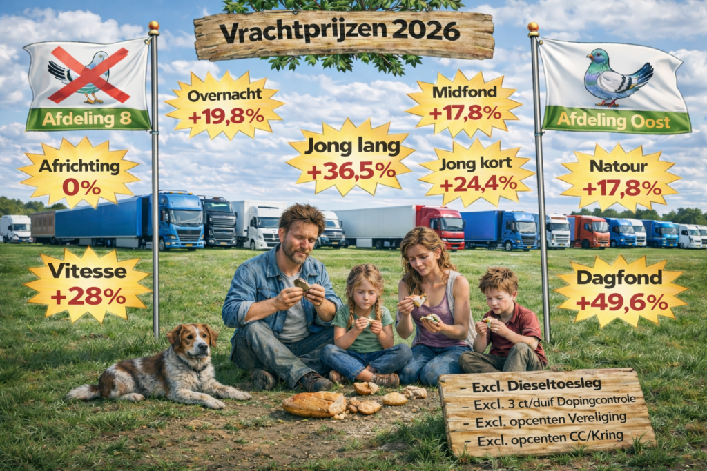 Op de africhtingsvluchten gingen er 27 duiven in de mand. Nu in 2026 mogen dat er maar 25 zijn. Dat houdt in dat de vrachtprijs met 8% omhoog moet om dezelfde opbrengst te krijgen. Als voorbeeld een simpele rekensom, we gaan uit van 1 euro per duif aan vrachtkosten. In 2025 dus 27 x 1 = 27 euro. In 2026 moeten 25 duiven 1,08 kosten om dezelfde opbrengst te halen. 25 x 1,08 = 27 euro. Alle vluchten met de oude duiven met 1 nacht mand krijgen al een verhoging van 8% om dezelfde opbrengst te halen.