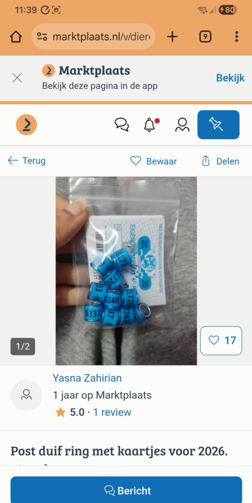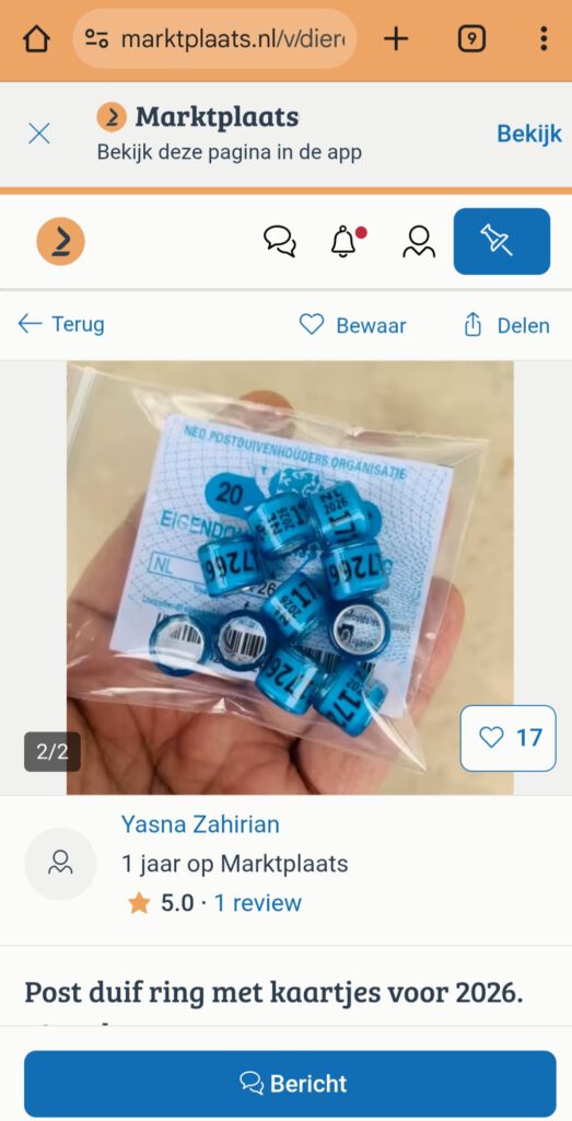 PAS OP: De kans is ook aanwezig dat er duiven worden aangeboden met de bovenstaande ringen om. Wees dus waakzaam wat u koopt en controleer goed of de verkoper wel betrouwbaar is en of de ringnummers wel zijn uitgegeven. Raadpleeg desnoods eerst op de NPO site bij DUIF GEVONDEN, of het ringnummer wel bestaat.