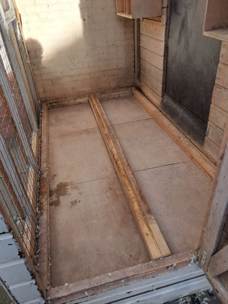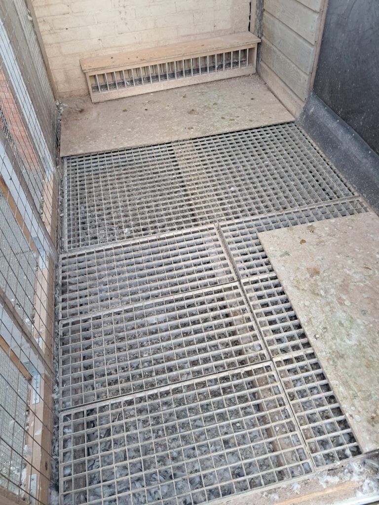 In de praktijk bleek dat ik een beste misrekening had gemaakt. Als ik het hok in ging, bleken de vloerplaten door te buigen door mijn gewicht. Oplossing was om de vloerplaten weer te verwijderen en eerst de roosters er weer in te leggen met daarop de vloerplaten. Ik had er ook extra balkjes onder kunnen leggen, maar dit was de makkelijkste oplossing.