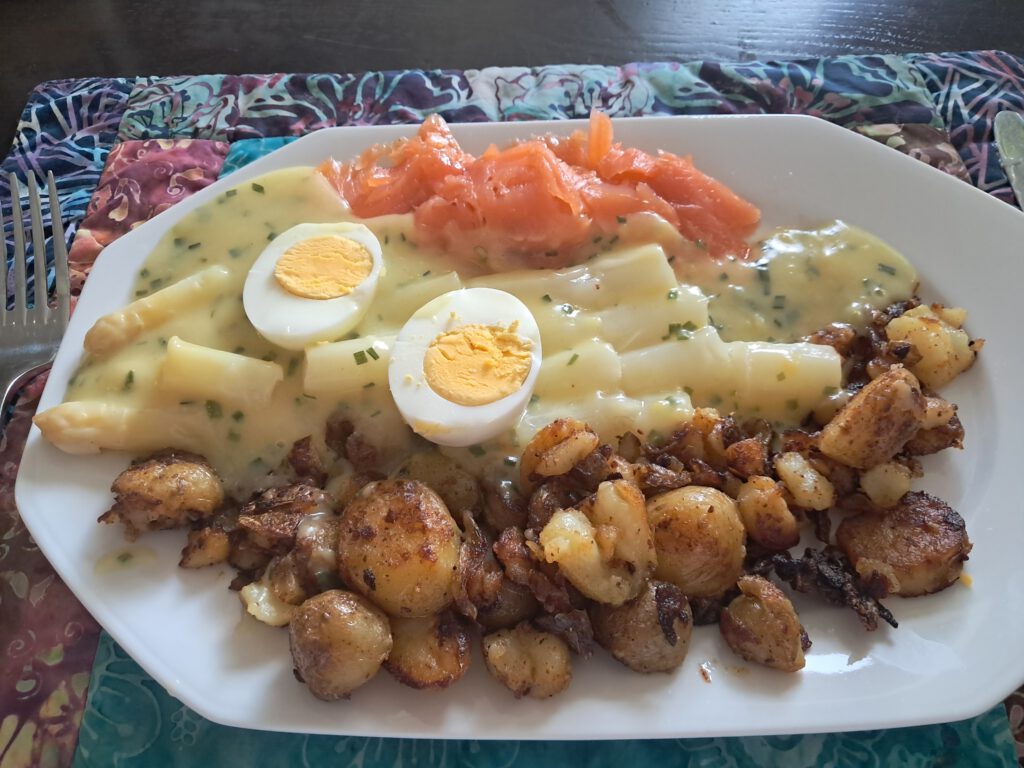 Ik ben begonnen om 16.30 uur de vliegduiven te pakken, om 17 uur zat alles in de mandjes, daarna meteen hun afdelingen schoon gemaakt. Ik was klaar om 17.30 uur, de afgesproken tijd met Dini om te gaan eten. Als ze beschikbaar zijn, op de vrijdag asperges met gebakken aardappelen en gerookte zalm.