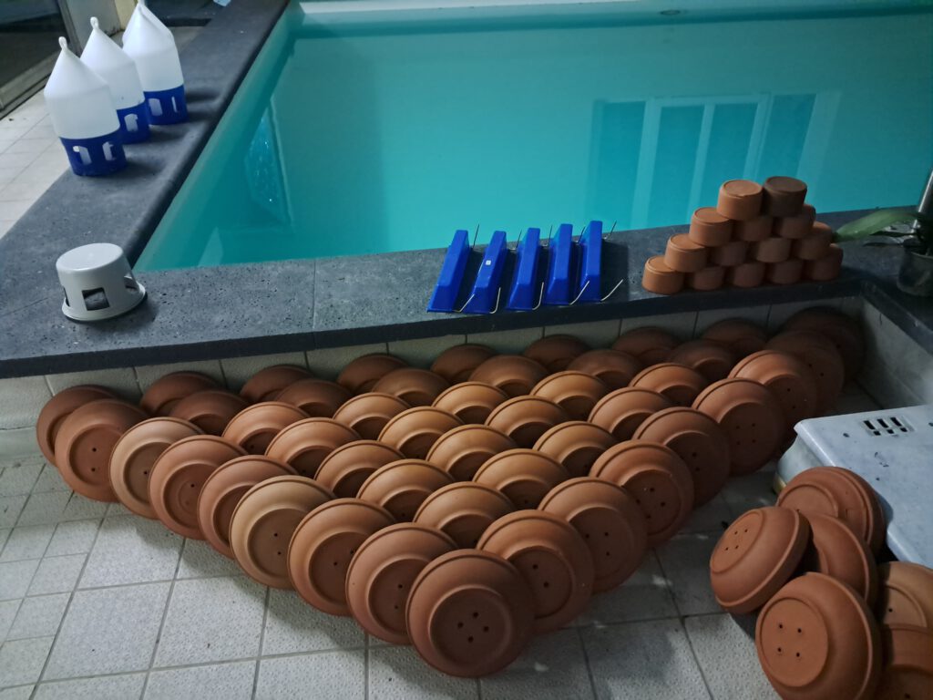 Vrijdagmiddag nog even 51 broedschotels schoon gemaakt, dat ging prima want die hadden al ruim twee weken in het water gestaan. (Niet in het zwembad, mocht u dat denken)