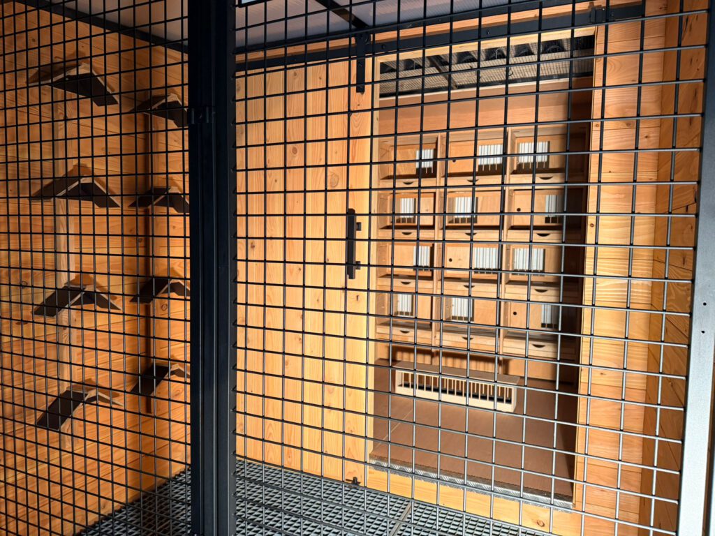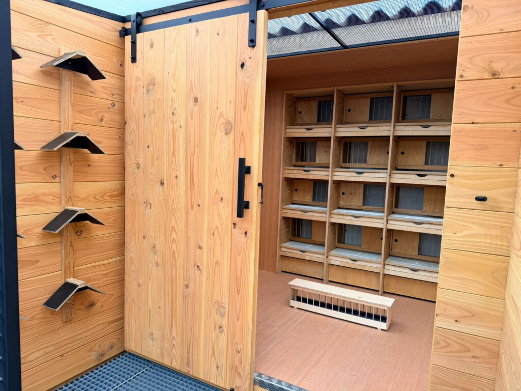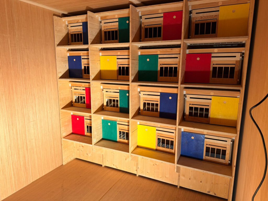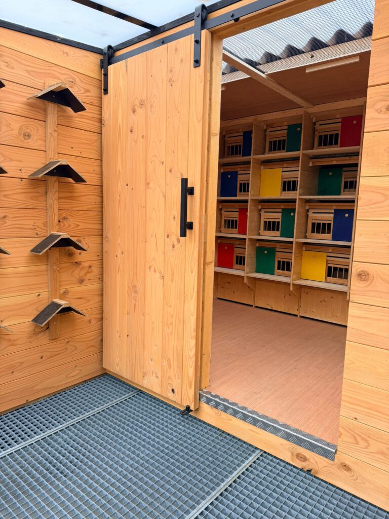 Toen ik bij Martin van Zon op bezoek was, zaten zijn weduwnaars mooi rustig in hun broedvak. De bovendeur stond open met een raamwerk van hout erin zodat de weduwnaars niet in de ren konden. De schuifdeur is een keuze maar gaat wel ten koste van je mogelijkheid om extra zuurstof in het nachthok te brengen indien je duiven niet in het rengedeelte mogen zitten. Bij mij staan de deuren altijd open, maar het nadeel is dat mijn weduwnaars minder rust krijgen. Dat is ook een bewuste keuze.