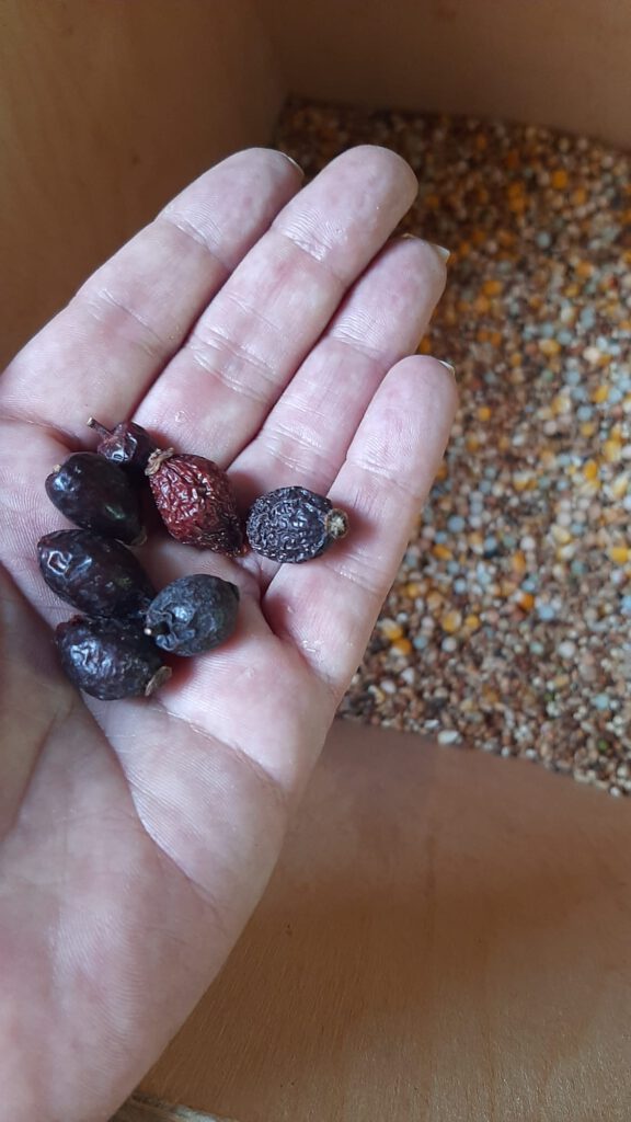 Sabine had dit jaar een zak voer (B merk) met heel andere korrels er door heen gemengd.