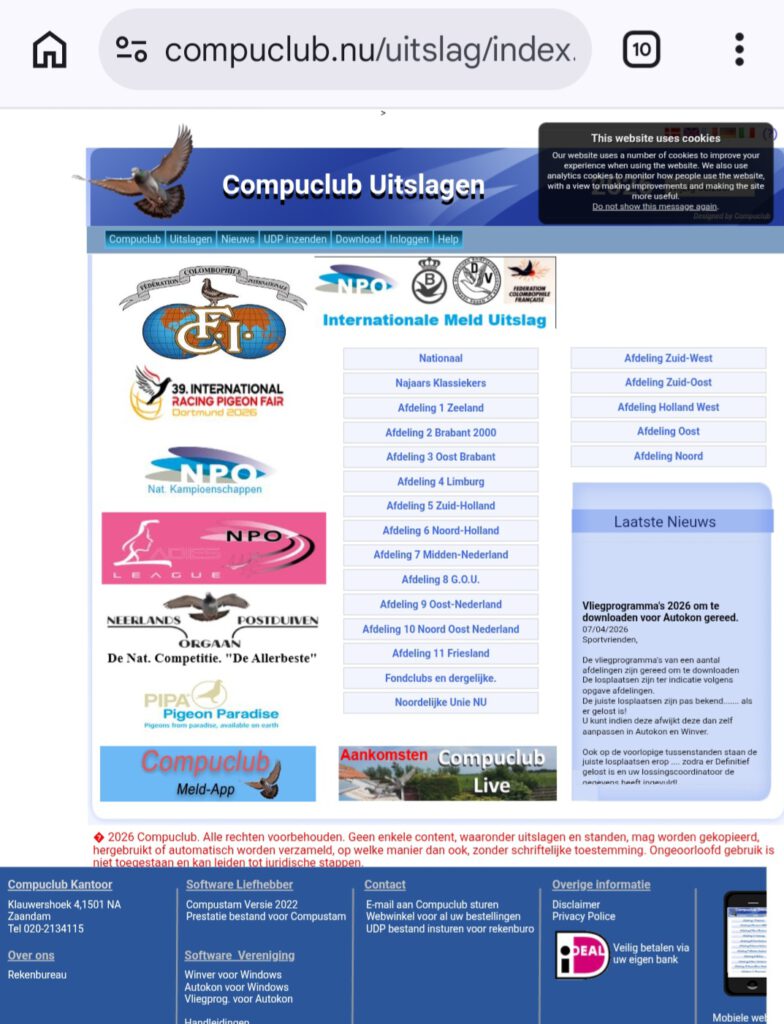 Afgelopen week ging het niet goed met de live meldingen bij Compuclub, het lijkt erop dat ze behoorlijk achter lopen om alles goed te zetten. Maar, we betalen compuclub rekengeld per duif en hebben een abonnement voor de live meldingen, en als ik het goed lees mag er niets meer gedeeld worden zonder vooraf toestemming te hebben aangevraagd. Lekker dan, veel liefhebbers delen de uitslagen en meldingen via Facebook etc. Ik denk dan dat het een mooie reclame/promotie is voor compuclub dat er veel gedeeld wordt. Bij compuclub denken ze daar schijnbaar anders over.