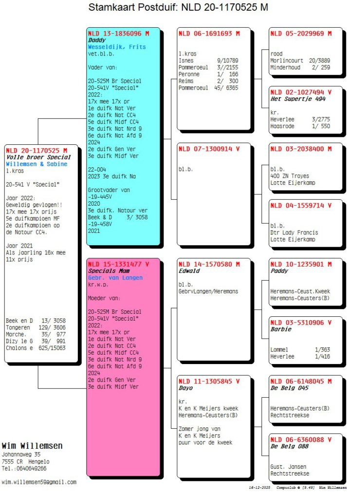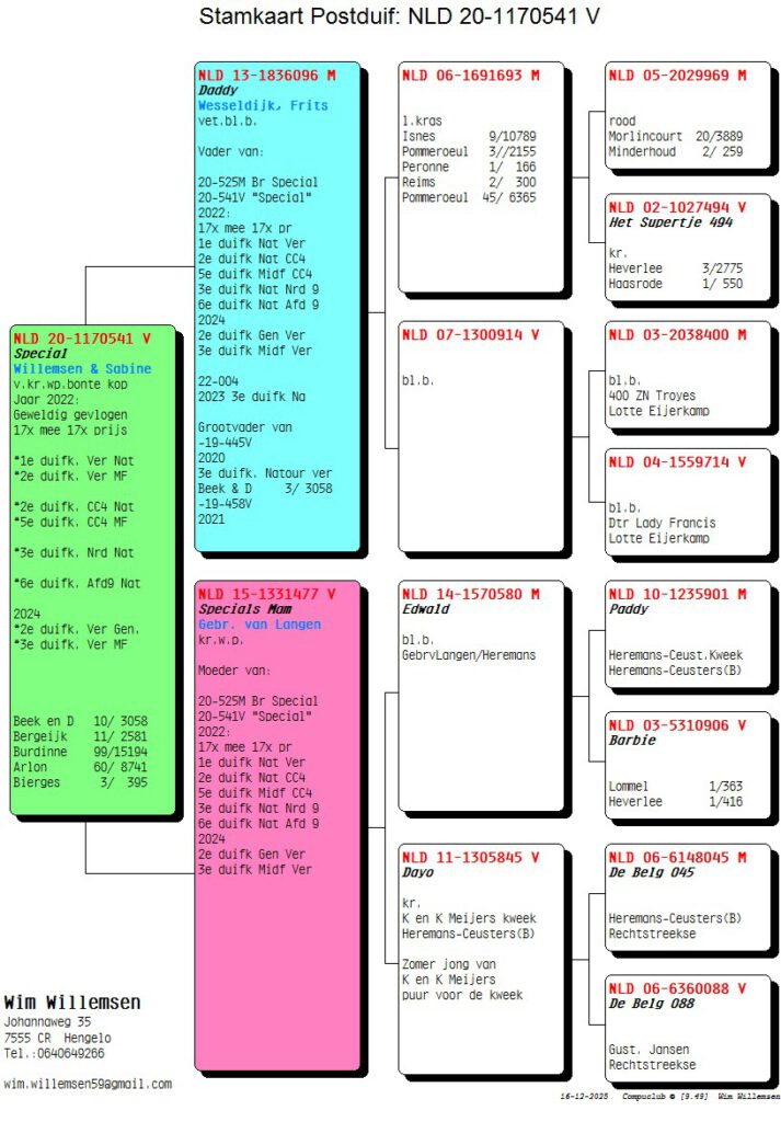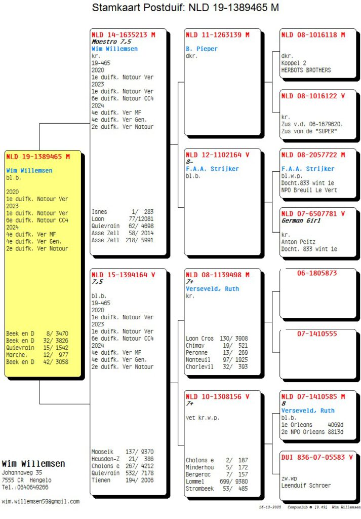 Onderstaand de stamkaarten van de drie ingebrachte vliegduiven.