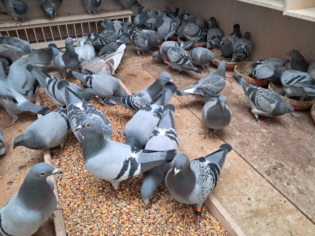 Ik heb ook een groot deel van de vliegduivinnen, afgezet met hun jongen, vandaar dat u ook oude duiven op de bovenstaande foto ziet staan. De duivinnen voeren nu mooi alle jongen behalve die van Jan en Joke Kaman die jongen zijn een tweetal weken ouder.