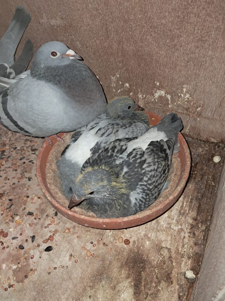 Ik had een goede twee weken geleden al van hun beste vliegkoppel twee eitjes opgehaald die bij mij zijn uitgebroed door een kweekkoppel. Onderstaand de twee jongen.
