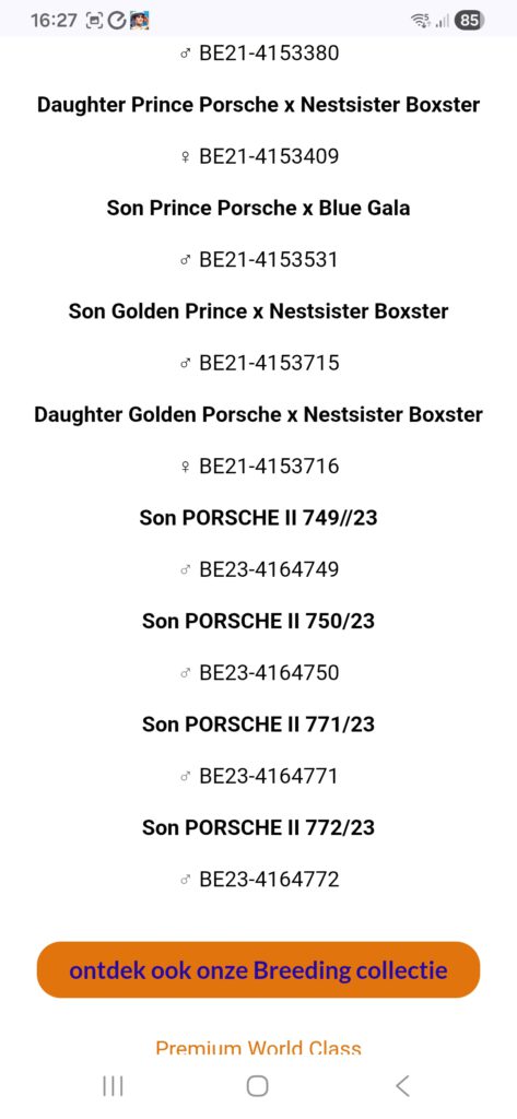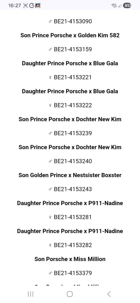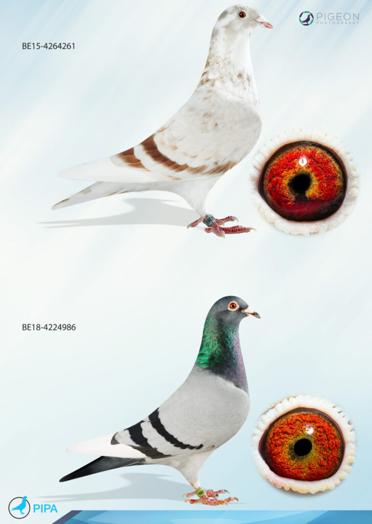 Wat we ook zien de laatste tijd is dat Pipa eigen jongen inbrengt in de verkoop. Hier te zien bij de duiven van 2023, vier zonen van Porsche 2.