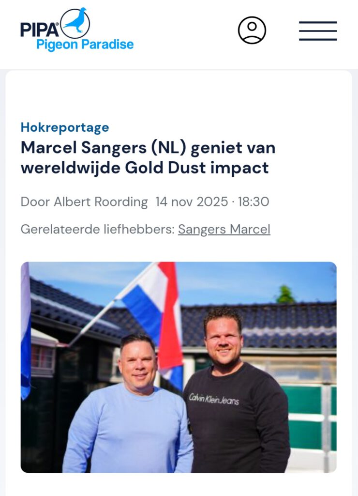 Gold Dust zit niet bij M.S. als je A.R. al zou kunnen geloven, ook de Urker wonderboy had deze duif niet op zijn kweekhok zitten, dus de duif is onder gebracht bij Pipa. (In samenkweek met M.S.)