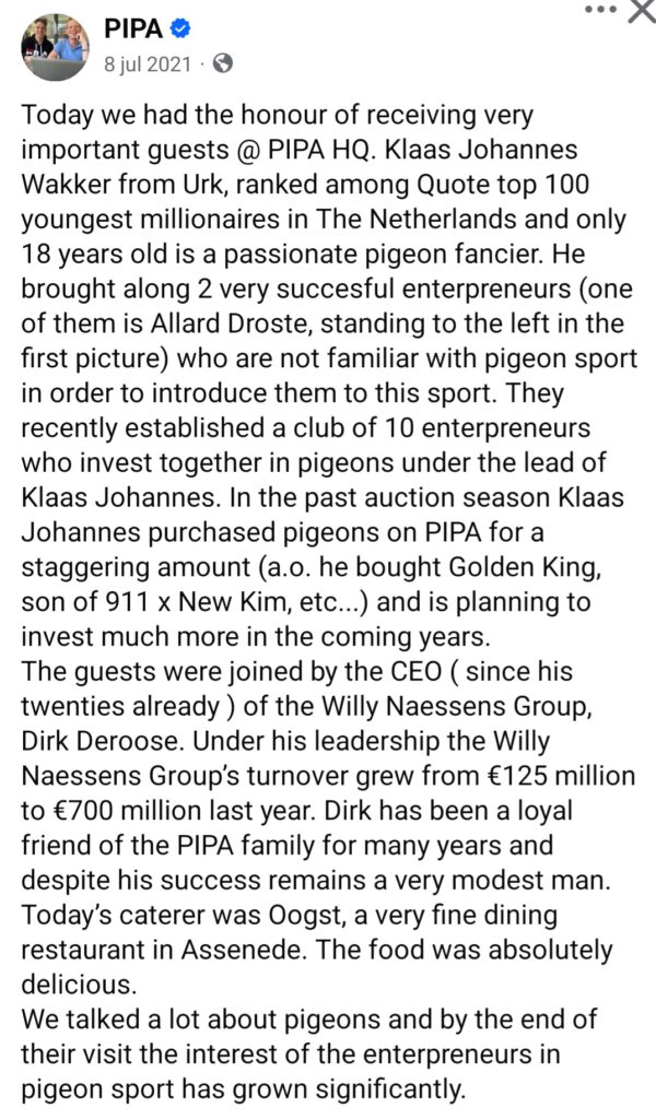 Het zou theoretisch ook nog kunnen dat de Urkse wonderboy koop 1 wel betaald heeft en daar 21 jongen van 2021 van Pipa voor terug heeft gekregen, maar in het nieuwe boek staat geschreven dat niet alle aangekochte duiven ook daadwerkelijk betaald werden.