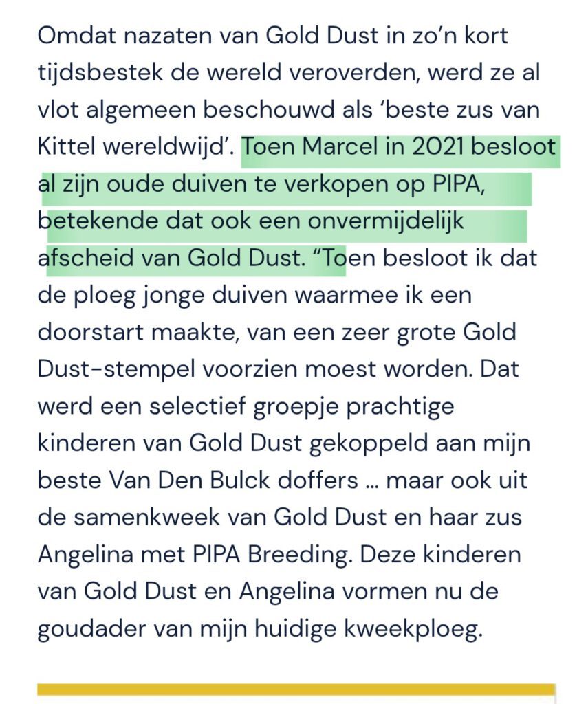Er staat geschreven: Toen Marcel in 2021 besloot al zijn oude duiven te verkopen op Pipa, betekende dat ook een onvermijdelijk afscheid van Gold Dust.