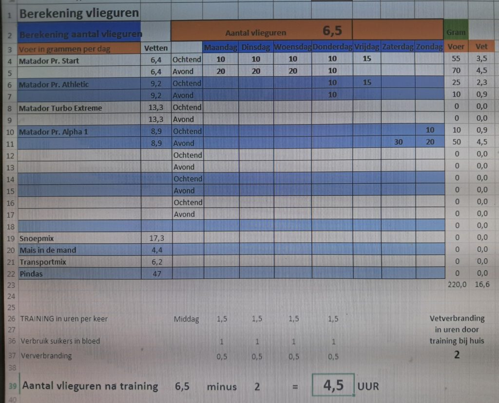 Pas op: ook in het excel overzicht betreffende de berekening van het aantal vlieguren zijn de grammen voer een gemiddelde.