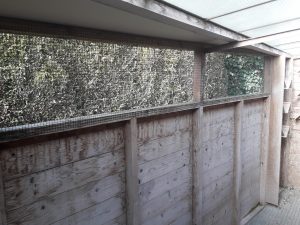Het dak was gemaakt van draadglas, de voorkant een deel gaas, al het groen erachter was de grote heg van de achterbuurman. Alles op roosters en aan de voorzijde gaas aan de onderkant waar de mest op het zand valt. Er was maar 1 probleem en dat was dat ik met de prestaties van mijn duivinnen behoorlijk afhankelijk was van de temperatuur in hun verblijf. Op de laatste foto kun je zien dat er twee luiken waren (o.a. helemaal achteraan rechts) waardoor de duivinnen naar hun doffers konden gaan. Toen speelde ik nog 1 doffer op 1 duivin.
