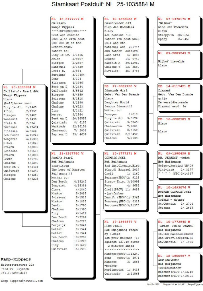 Het aantal referenties van andere liefhebbers die goed presteren met duiven van de Combinatie Kamp/Kippers groeit elk jaar. Dat aantal gaat alleen nog maar toenemen want als je zulke klasseduiven op je hok hebt zitten dan kan dat niet anders. De liefhebbers die duiven aanschaffen van de Combinatie Kamp/Kippers profiteren daar van. Ik heb ze zelf ook zitten dus ik weet er alles van.