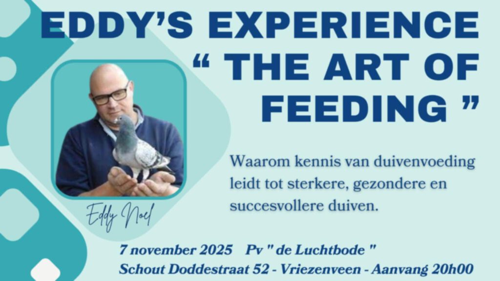 Op vrijdagavond 7 November komt Eddy Noël een lezing geven “Waarom kennis van duivenvoeding leidt tot sterkere gezondere en succesvollere duiven”. Aanvang 20.00 uur bij P.V. de Luchtbode te Vriezenveen.