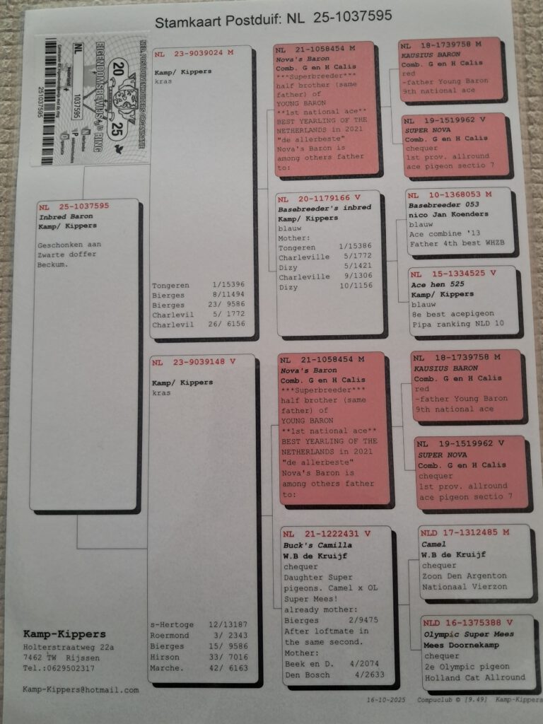 Maar de Combinatie Kamp/Kippers heeft een jonge duif van 2025 geschonken aan “De Zwarte Doffer” te Beckum voor hun bonnen verkoop. Deze jonge duif komt uit ouders die geweldig hebben gevlogen, zie de onderstaande stamkaart.