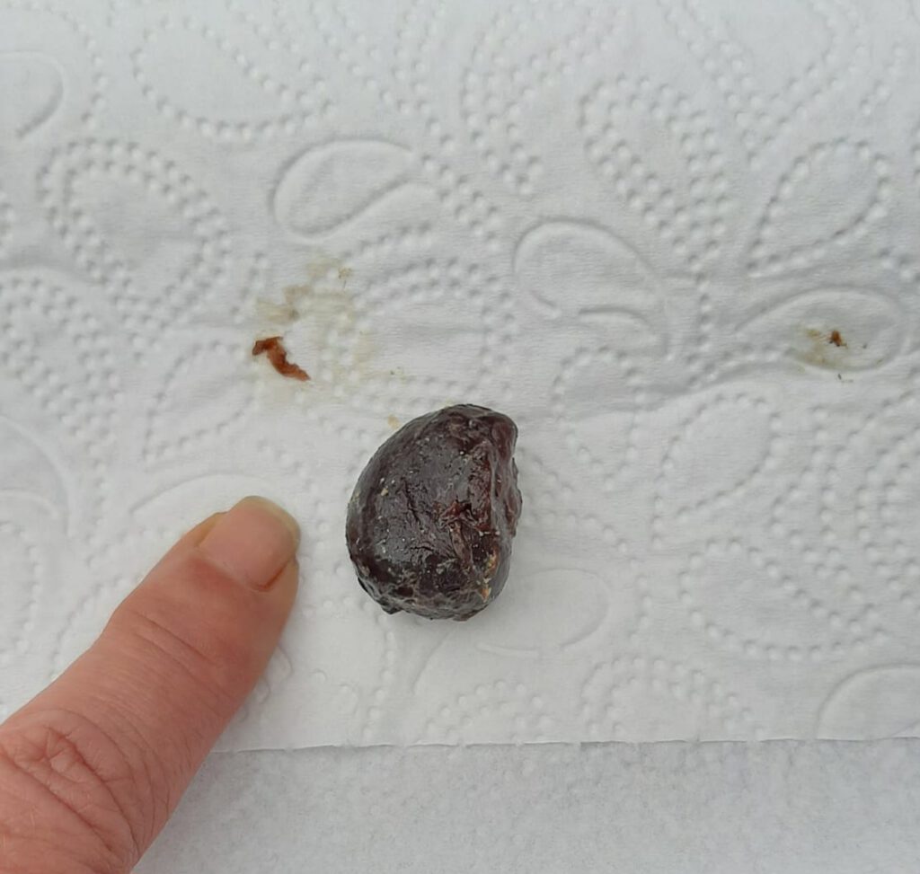 Zijn antwoord was: Lijkt me een oud bloedstolsel uit de eileider, wellicht kan ze nu wel leggen.